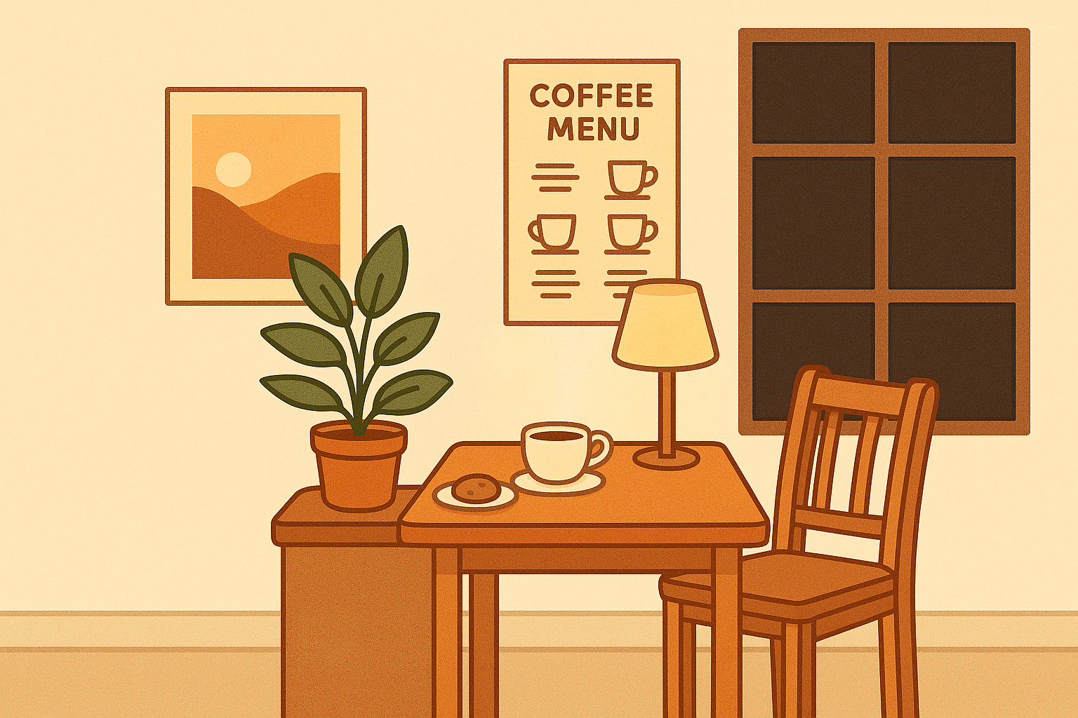 ‘한 평 카페’의 따뜻하고 감성적인 분위기를 담은 가로형 일러스트입니다. 우드톤 테이블, 조명, 식물, 그리고 벽의 포스터까지 — 공간은 작지만 분위기는 꽉 찬 홈카페 입니다.