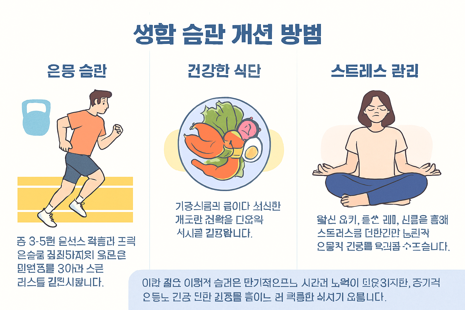 • 운동 습관: 주 3~5회 유산소 운동과 근력 운동을 병행하세요. 운동은 면역력을 높이고 스트레스를 감소시킵니다.