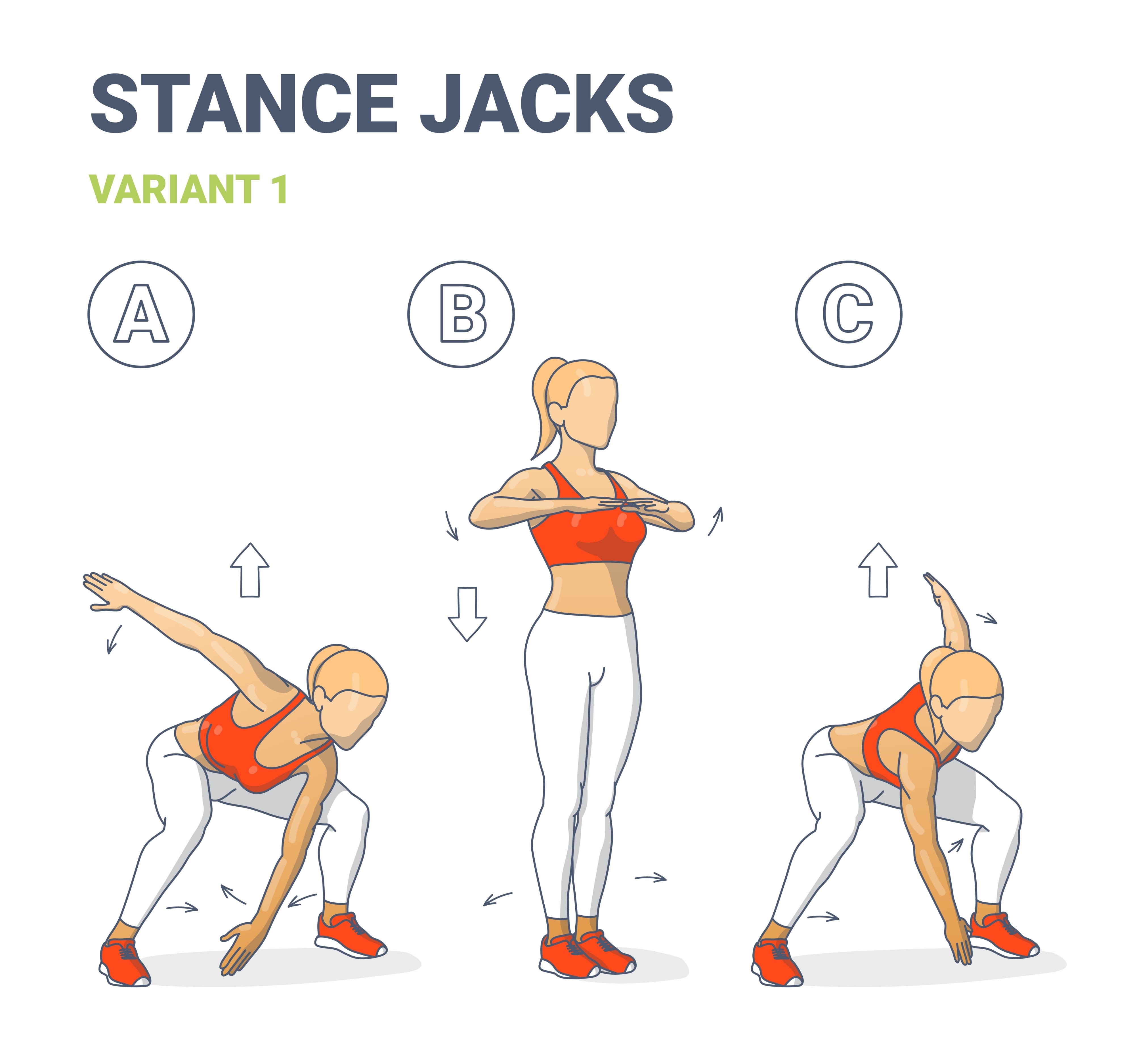 A단계 - 왼쪽 점프 잭 다음으로 스모 스쿼트 자세로 발을 넓게 벌리고 점프합니다. 동시에 왼팔이 뒤로 흔들리는 동안 오른손을 발 사이 바닥으로 가져갑니다. 그런 다음 발을 다시 함께 점프하고 시작 자세로 돌아갑니다. 단계 B - 시작 위치 시작 자세는 발을 모으고 손을 가슴 앞에 대고 서 있는 자세입니다. 팔꿈치는 구부리고 가슴은 위로 올리고 등은 곧게 펴야 합니다. C단계 - 오른쪽 점프 잭 C단계에서는 A단계와 동일한 동작을 반복하지만 반대쪽 팔로 합니다. 스모 스쿼트에 뛰어들어 왼손을 바닥으로 가져간 다음 오른팔을 뒤로 휘두릅니다. 발을 다시 모아 다시 시작 자세로 돌아갑니다.