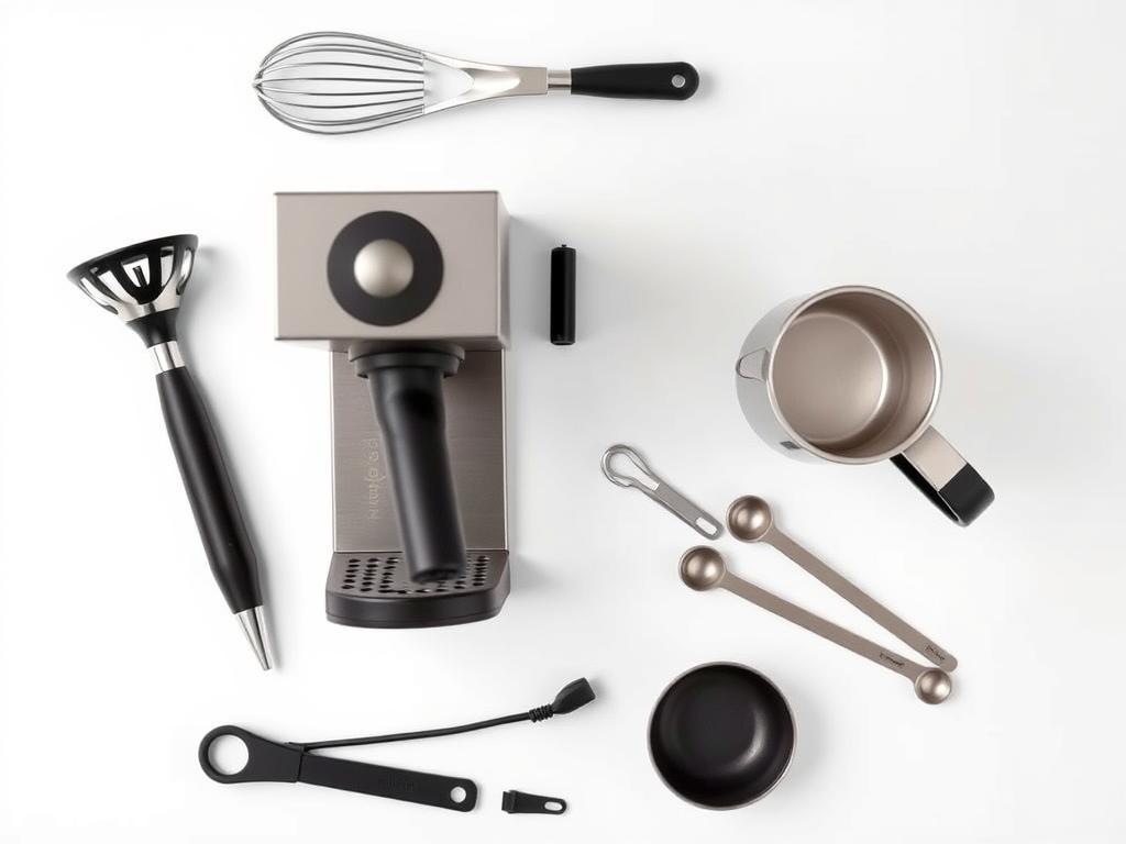 프롬프트: "Organized flat lay of home barista tools - milk frother, small saucepan, whisk, measuring spoons, clear glass cups, on white background, clean product photography, Korean minimalist style"