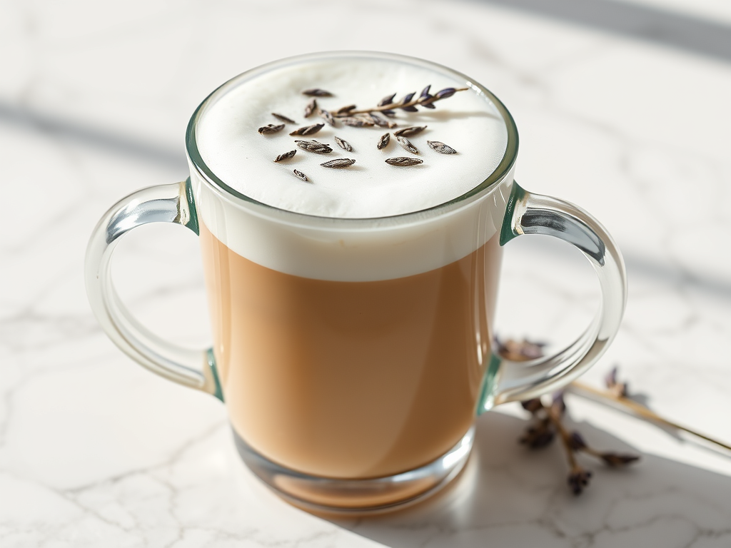 프롬프트: "Glass cup filled with creamy Earl Grey latte showing beautiful layers, dried lavender sprigs on saucer, white background, minimalist Korean cafe aesthetic, soft natural light, food photography"