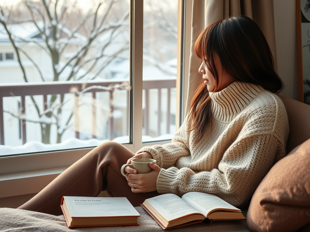 프롬프트: "Cozy Korean living room scene, person in comfortable clothes sitting by window with steaming mug, book nearby, winter view outside, warm afternoon light, lifestyle photography, hygge concept"
