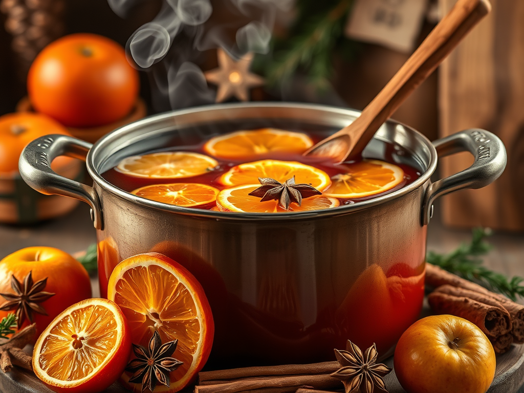 프롬프트: "Large glass pot of mulled apple cider with floating orange slices, cinnamon sticks, star anise, steam rising, two cups beside it, dark background, cozy winter entertaining scene"