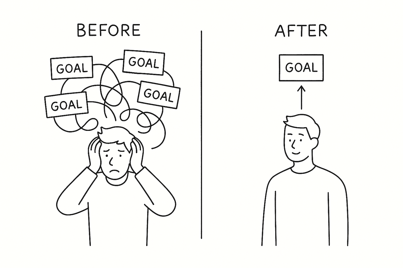 삽화 프롬프트: 너무 많은 목표로 혼란스러워하는 사람 vs 하나의 명확한 목표에 집중하는 사람 비교 이미지, before/after 스타일, 왼쪽은 복잡하고 오른쪽은 깔끔한 대비, 심플한 라인 드로잉