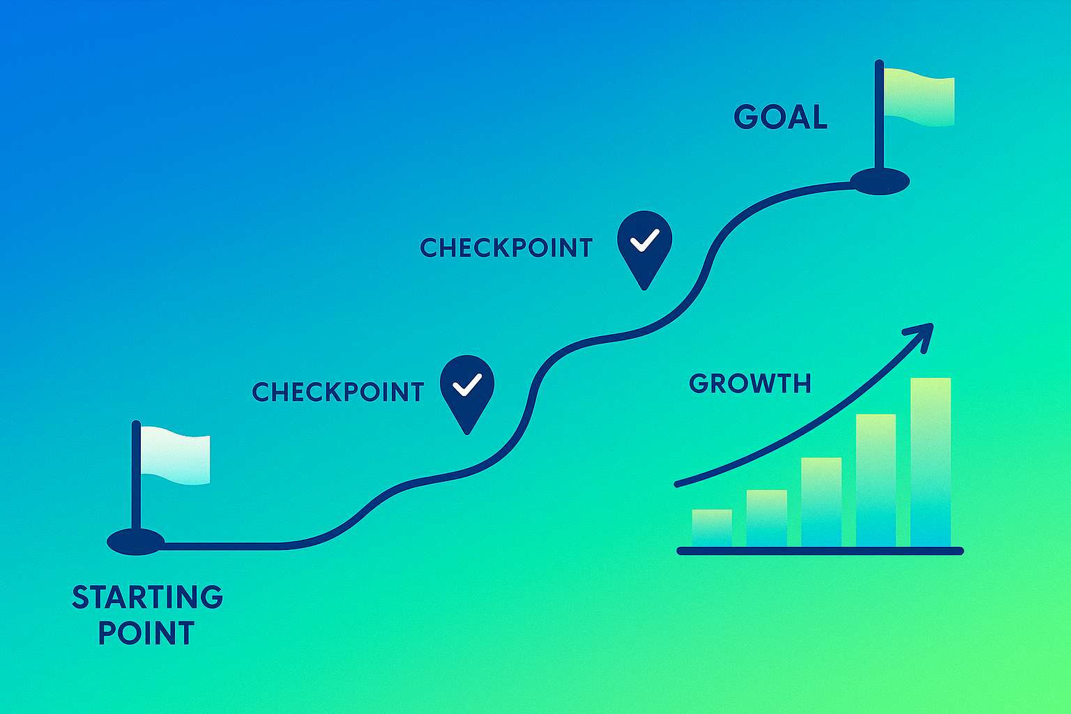 삽화 프롬프트: 목표 달성 과정을 나타내는 타임라인, 시작점에서 목표 지점까지 이정표와 체크포인트, 성장 그래프, 여정을 시각화한 인포그래픽, 블루와 그린 그라데이션