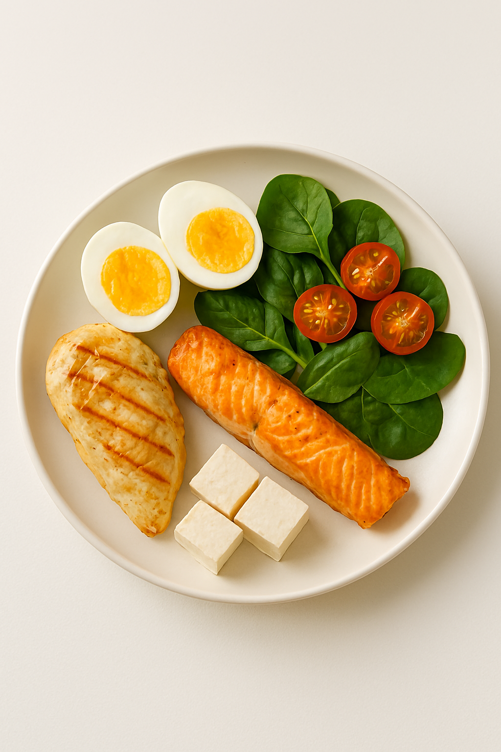 “건강한 단백질 식단: 접시 위에 구운 닭가슴살, 삶은 계란, 구운 연어, 두부, 샐러드가 함께 담긴 장면, 밝은 자연광, minimal, diet and nutrition concept”
