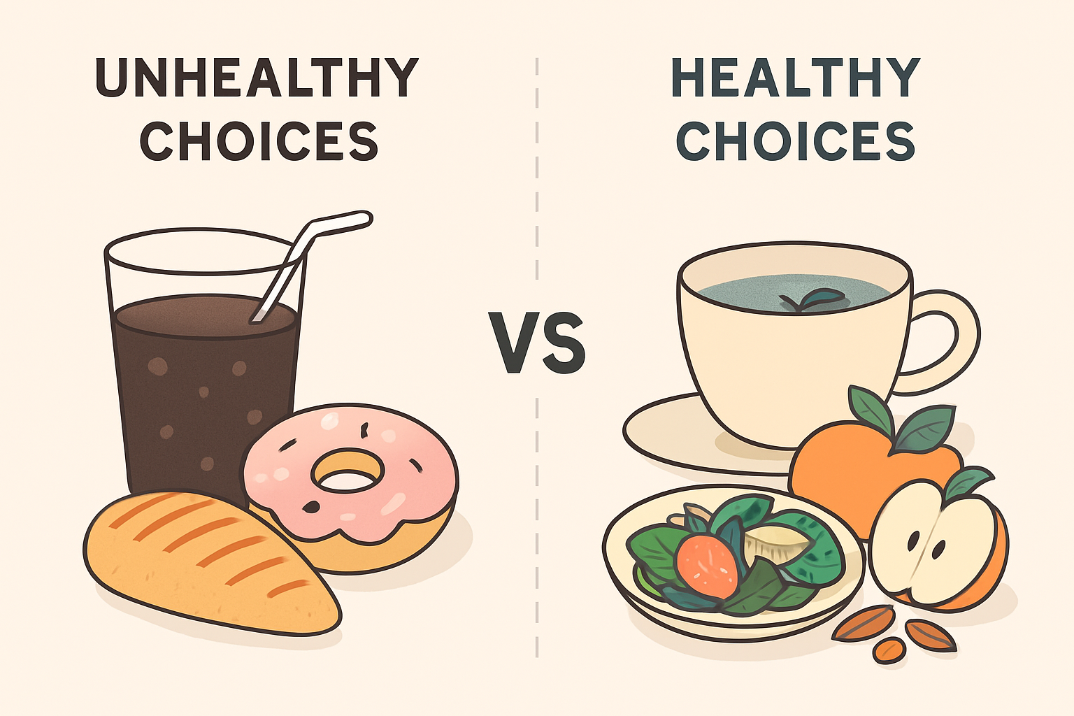 “왼쪽에는 탄산음료와 도넛, 오른쪽에는 허브티와 과일, 견과류가 대비되게 놓인 테이블, 건강한 선택 vs 나쁜 선택을 보여주는 인포그래픽 스타일, clean layout”