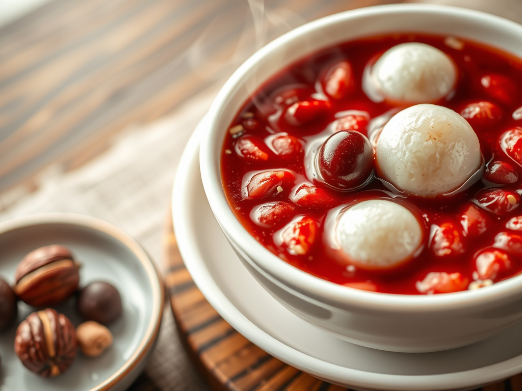“흰 도자기 그릇에 담긴 진한 붉은색 동지 팥죽, 위에 동글동글한 새알심이 떠 있고, 옆에는 작은 접시에 대추와 견과류 토핑이 놓여 있는 모습, 따뜻한 수증기가 살짝 보이는 근접 촬영, 겨울 감성 푸드 포토그래피”