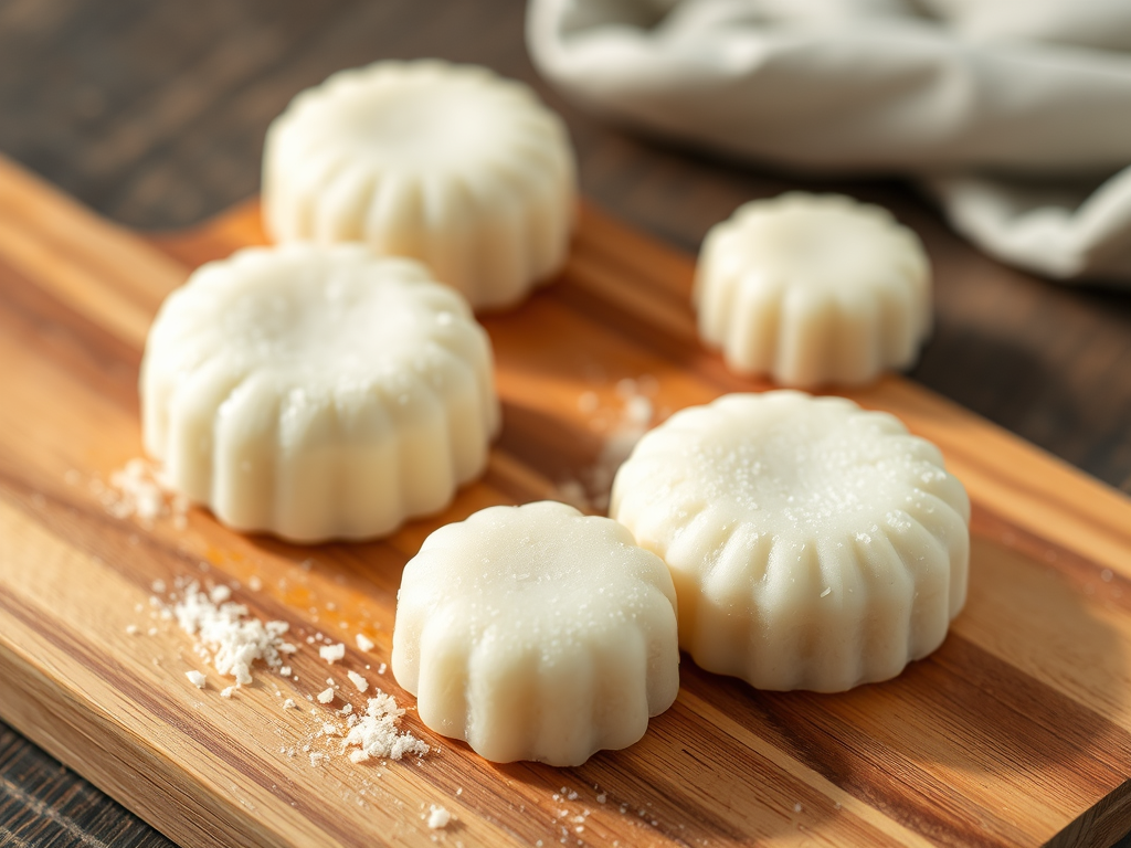 “나무 도마 위에 가지런히 올려진 하얀 새알심들, 동그랗고 귀여운 모양, 옆에는 약간 흩어진 찹쌀가루, 부드러운 자연광, 미니멀하고 깨끗한 푸드 사진”
