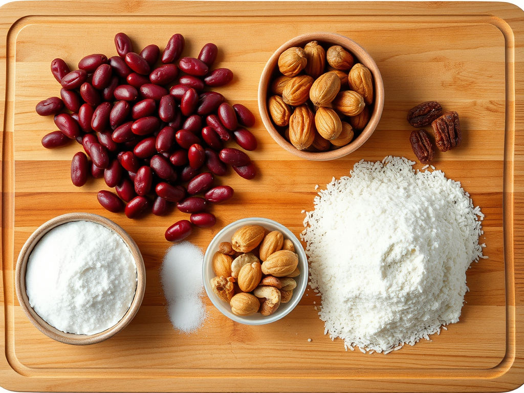 “나무 도마 위에 생 팥, 새알심용 흰 찹쌀가루, 소금, 설탕, 작은 그릇에 담긴 견과류와 대추가 예쁘게 정리된 상차림, 한국 전통 레시피 준비 장면, 위에서 내려다보는 구도, 밝고 깨끗한 푸드 스타일링 사진”