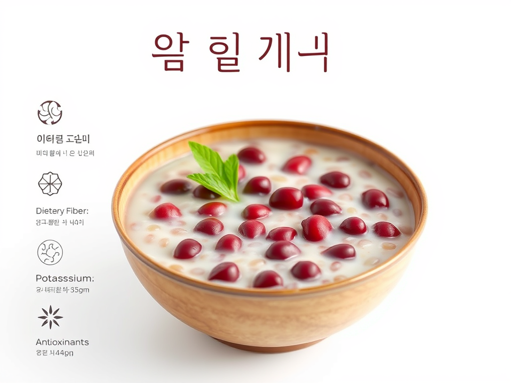 “붉은 팥과 완성된 팥죽 그릇을 중심으로, 단백질, 식이섬유, 칼륨, 항산화 성분 등을 아이콘과 짧은 텍스트로 표시한 인포그래픽, 심플하고 모던한 한국어 텍스트 디자인, 블로그용 일러스트”