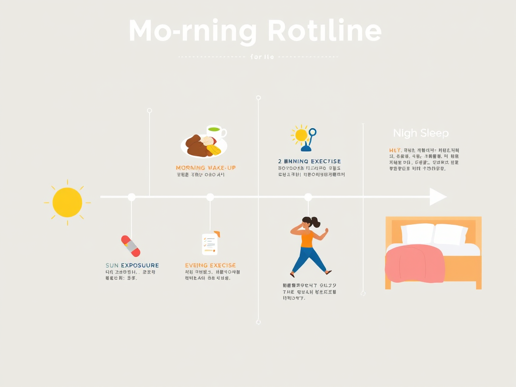 “아침 기상 → 아침 식사와 보충제 → 낮 햇빛 노출 → 저녁 운동 → 밤 수면 준비까지 이어지는 하루 루틴을 시간 순서대로 보여주는 타임라인 인포그래픽, 각 단계마다 아이콘(해, 접시, 알약, 운동하는 사람, 침대)이 들어간 평면 스타일 일러스트, 파스텔 톤, 한국 블로그 헬스 콘텐츠용”