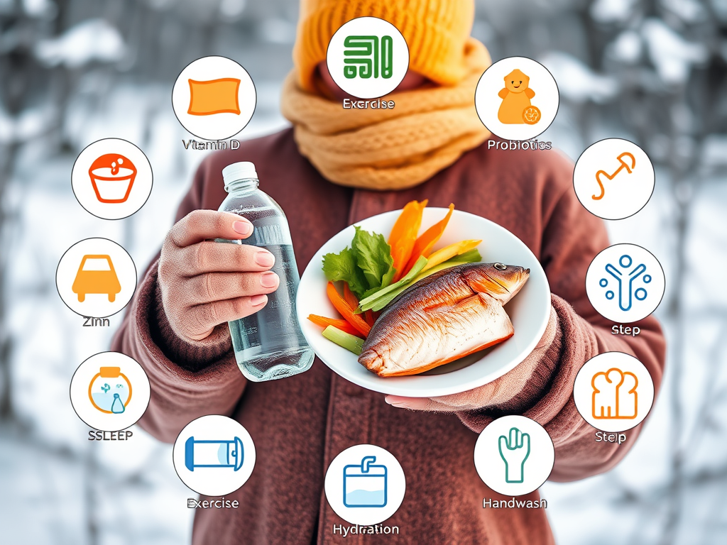 “겨울 배경 속에서 한 사람이 따뜻한 옷을 입고, 한 손에는 물병을, 다른 손에는 야채와 생선이 담긴 접시를 들고 있다. 주위에는 비타민 D, 아연, 프로바이오틱스, 운동, 수면, 수분, 손 씻기 아이콘이 원형 인포그래픽처럼 배치된 평면 일러스트, 밝고 깨끗한 색감, 한국 블로그용 헬스 케어 인포그래픽 스타일”